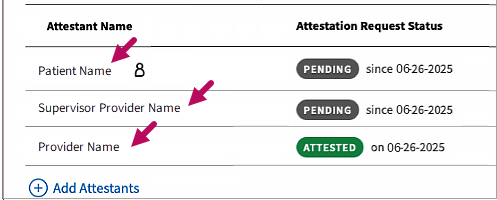 Note: If you added a person attesting on behalf of the patient, such as a guardian, the patient icon appears to the right of their name as well as their relationship to the patient.