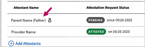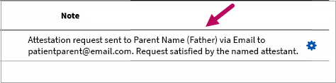 Once the designated attestant responds, the following text appears in the Note field: "Attestation request sent to <designated attestant's name (relationship to patient)> via <Email / SMS> at <contact address / number>. Request satisfied by the named attestant."