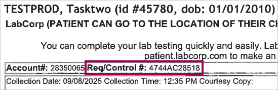 When you print signed LabCorp orders, orders with matching variables are split into groups and labeled with a unique accession ID. Each group of similar orders is printed on a separate page of the test requisition, and each specimen is packaged separately with its own unique requisition. The Req/Control # on each page of the test requisition reflects the accession ID for a group of orders.