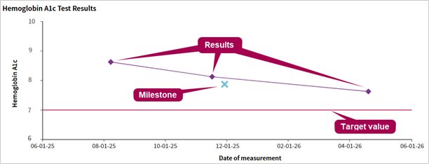 Once you begin measuring a clinical data point, you can visualize the patient's baseline value, target value, and milestones against recorded clinical data in the patient's chart. In the expanded view of the goal, athenaOne displays the relevant data in a line chart, allowing you to see at a glance how the patient is progressing toward the goal. To view the chart, locate the goal and click Show More.