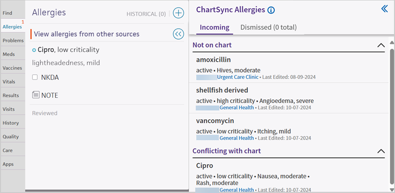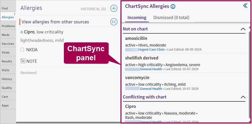 When allergies from other sources are available for manual reconciliation, they are displayed in the ChartSync panel to the right of the Allergies tab or Intake checklist.