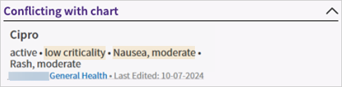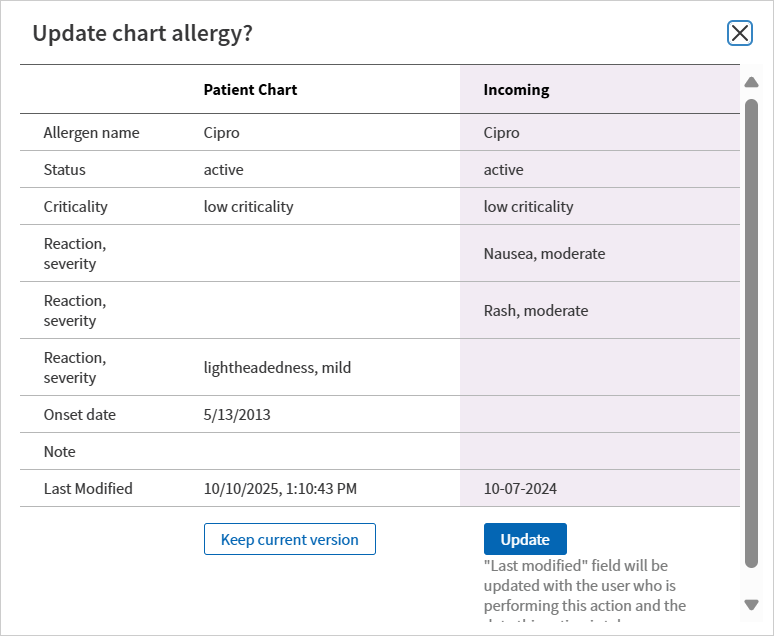 for an allergy that conflicts with information for that allergy in the chart (meaning that the allergy exists in the chart but the other source has a different criticality, status, reaction, or reaction severity), you will be prompted to update the chart allergy with the information from the incoming allergy or keep the chart allergy the same. Information related to the allergy that is different from your chart will be highlighted.