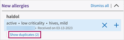 When the same allergy comes from multiple sources or the same source more than once, Show duplicates appears below the allergy with the number of identical instances in parentheses. Click Show duplicates to view all the sources.
