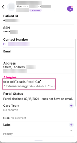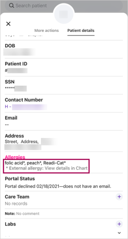 In athenaOne mobile, allergies from external sources appear in the expanded view of the patient banner and in the Patient details section of the Launchpad. Allergies from external sources have an asterisk (*) after the allergen name. Details about the allergy, including the name of the external source and the date when the allergy was automatically added, can be viewed on the Briefing, Chart, and Exam tabs.