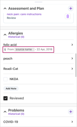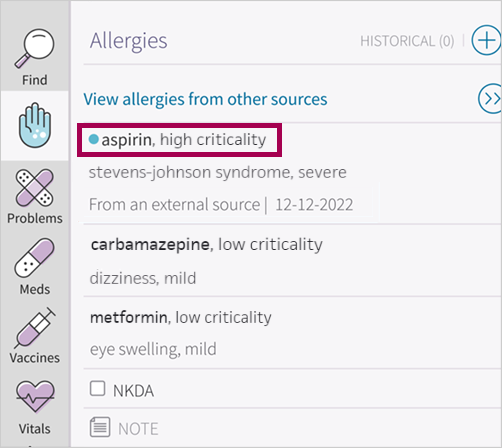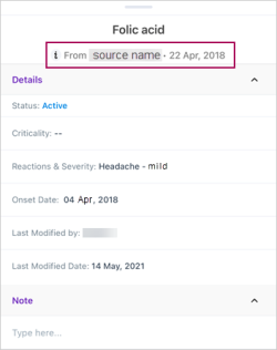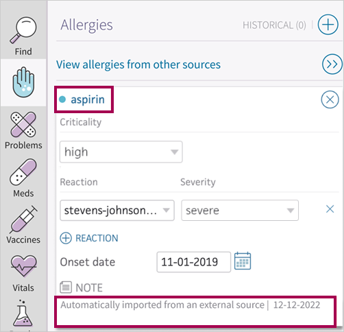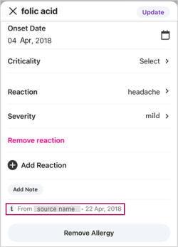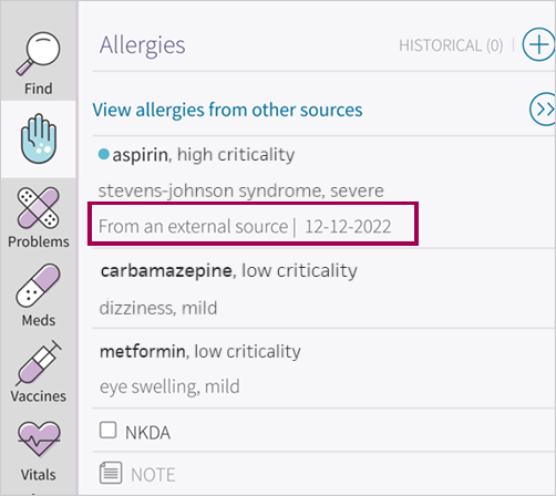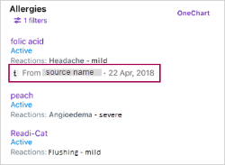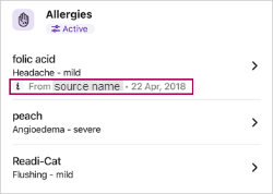 In the expanded view of the allergy, the blue dot next to the allergy indicates that it was added from an external source, and the source and date are displayed on the bottom of the allergy details.