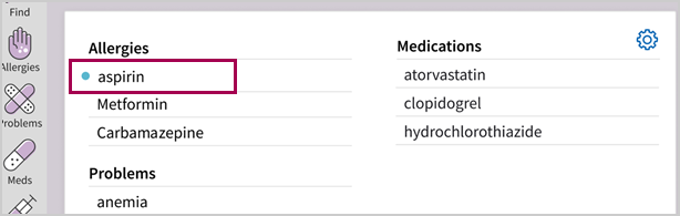 Automatically added allergies are also displayed alphabetically on the Allergies tab of the patient chart with a blue dot to indicate that it was added from an external source.