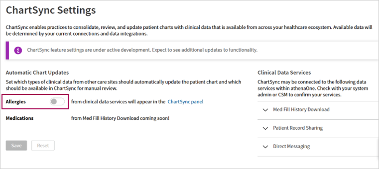 If you want to switch between manual and automatic allergy reconciliation, update the ChartSync setting below.