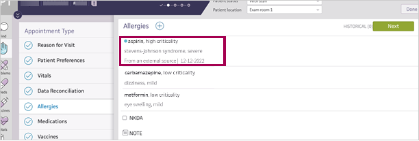 In the Intake stage, automatically added allergies are also displayed alphabetically in the Allergies section with a blue dot to indicate that it was added from an external source. The source of the allergy is displayed below the reaction and severity, as well as the date when the allergy was added.