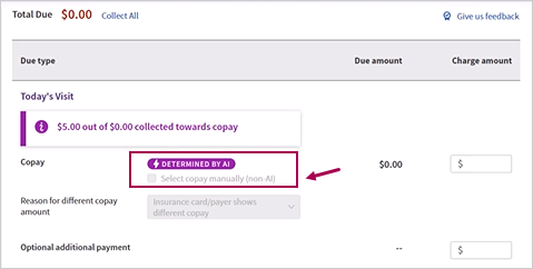 - The AI-determined Copay amount is currently only on the Check-in and Checkout pages. If the Copay amount is AI-determined, you'll see the "DETERMINED BY AI" label.