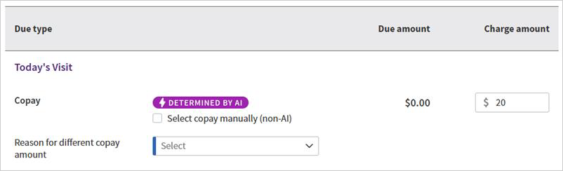 | The AI-determined Copay amount reduces manual effort and reduces clicks. |