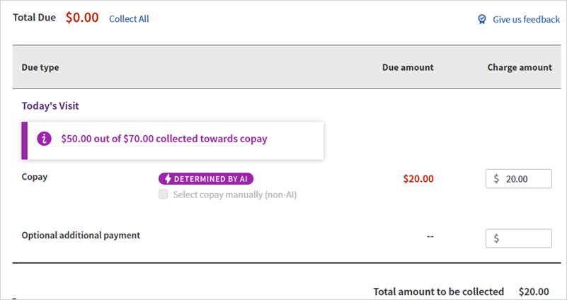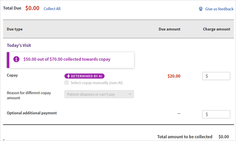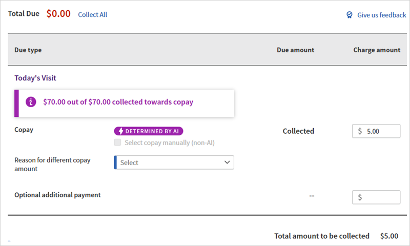 Use the AI-determined Copay amount for improved accuracy of the Copay amount on the Check-in and Checkout pages, and patient-facing enhanced self check-in.