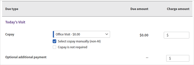 If you would like to view copays based on copay types from the Insurance Policy page for a given appointment, you can click the Select copay manually (non-AI) option on the Time-of-Service page.
