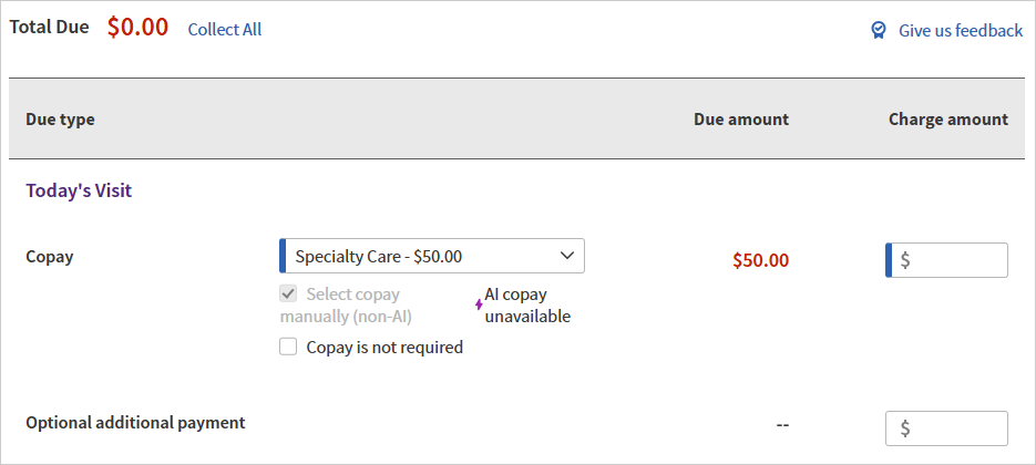 Copay Due amount displayed based on the selected Copay type.