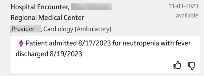 Unlike other documents received through patient record sharing, information about a patient's hospital visit — such as the summary of the visit and the hospital discharge documents — appear automatically in the chart without the need to download them manually. These important documents appear in the Recent Activity section of the patient briefing.