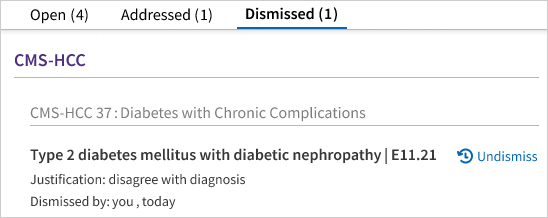 A provider can dismiss a diagnosis gap if that clinical condition is found to be irrelevant for the patient. Dismissed diagnosis gaps appear in the Dismissed tab of the Diagnosis Gaps dashboard. If the dismissed condition is later found to be relevant for the patient, the provider can reinstate the diagnosis gap as an open gap by clicking