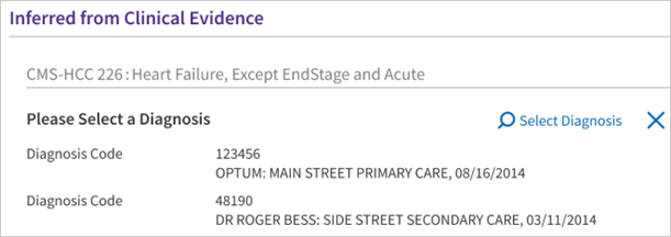Clinically inferred diagnoses are based on the condition category. The provider must determine the ICD-10 code. In addition, the Diagnosis Gaps dashboard displays only clinically inferred diagnosis gaps from third-party external sources received via API.