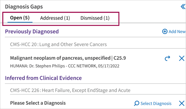 - Select the Open tab. The Diagnosis Gaps dashboard displays clinically verified diagnoses in the Previously Diagnosed section.