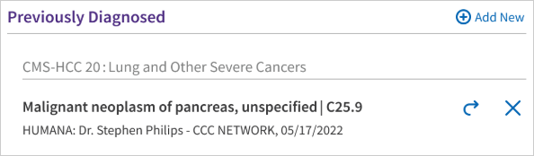 Add New next to Previously Diagnosed. The diagnosis selector opens. - Search for and select the most appropriate diagnosis. Each diagnosis includes an associated RAF weight.
