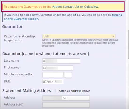 - See guarantor information appear as read-only on the Full Registration page with a link to the patient's Quickview where you can edit that information