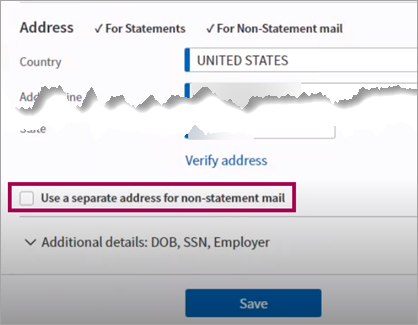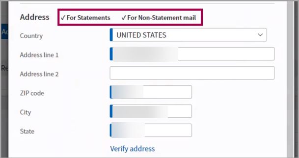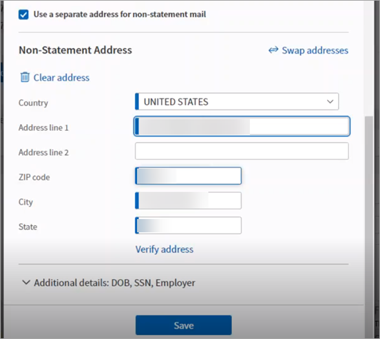 Fill out the address fields. You can click Verify address to confirm the address is accurate. You can click Clear address to remove the non-statement address or click Swap address to switch the non-statement address to the statement address.