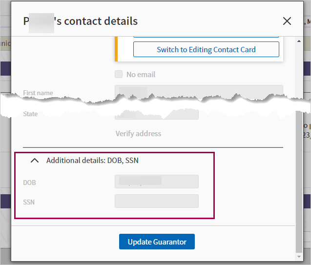 You can now see the date of birth and social security number information related to the Guarantor by clicking Edit on the Guarantor row in the Contact List.