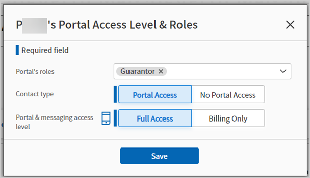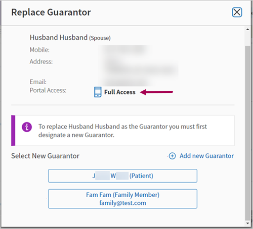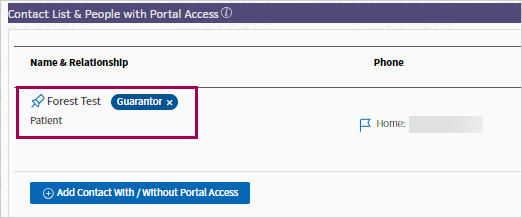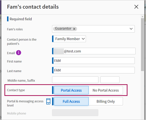 When editing or adding the guarantor information, you can now specify the Contact type. If you want to provide Patient Portal access to the guarantor, select Portal Access as the Contact type.