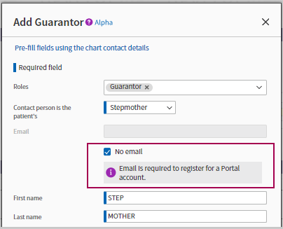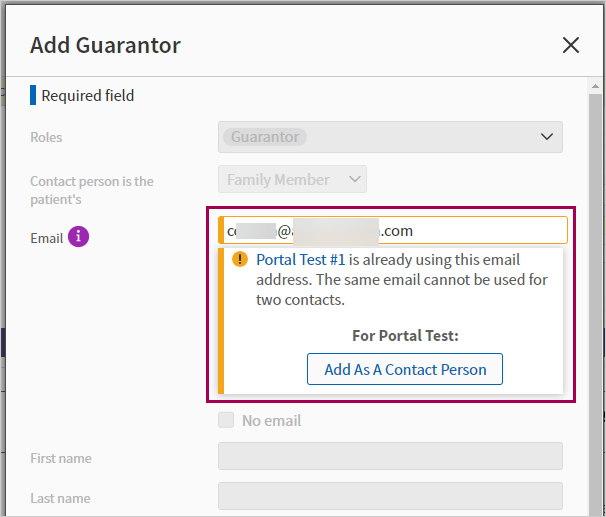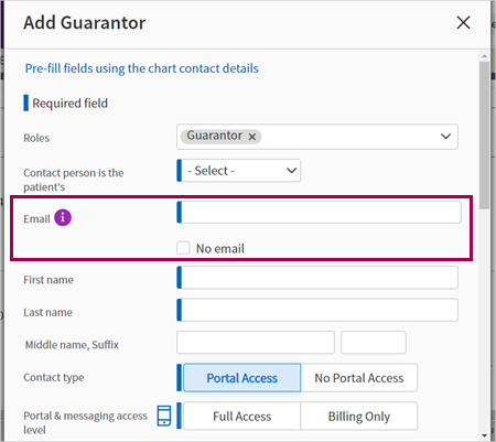 If there is no email address available for the guarantor, check the No email box. When you check this box, you cannot add Patient Portal access.