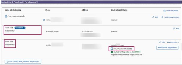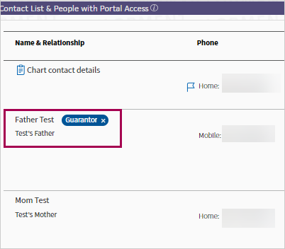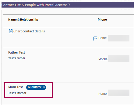 However with this new feature, the Contact List now displays one contact 'Mom test' who is both the guarantor and the Full access Patient Portal user for the patient. Moving forward, the guarantor and Patient Portal user are kept in sync which means any updates to the Patient Portal user also reflect in the Guarantor information.