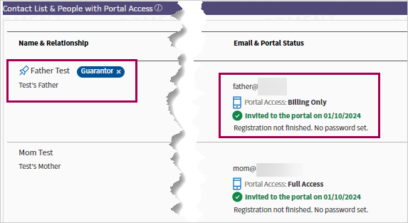 After you set a new guarantor, the guarantor label appears next to the newly assigned guarantor contact in the Contact List. For example: you replaced "Mom test" as guarantor and assigned "Father test" as guarantor.