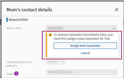 You can now set a guarantor role for the patient or any of the contact people in the Contact List. When the Guarantor role is set, it appears as a label in the Contact List.