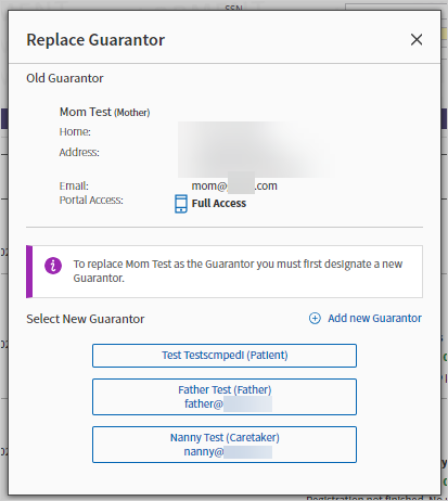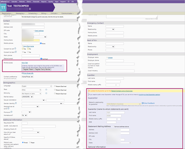For example, 'Mom test' has Patient Portal access to the patient. 'Mom test' is also the guarantor for the patient. Previously as shown below on full registration and on Quickview, there is no way to link the two separate pieces of information and track them as the same person.