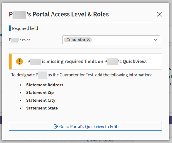 After adding this type of guarantor as a contact person, you must then assign the guarantor role to the contact. If any required fields are missing for the contact to be a guarantor, they are highlighted in the window as shown in the below image example. These fields would need to be updated on the patient's Quickview, this means you would be navigating away from the current patient's Quickview.