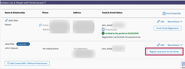 If there is a guarantor with an email address but hasn't registered for the Portal, clicking Register Guarantor for the Portal starts the workflow to register the guarantor for the Patient Portal.