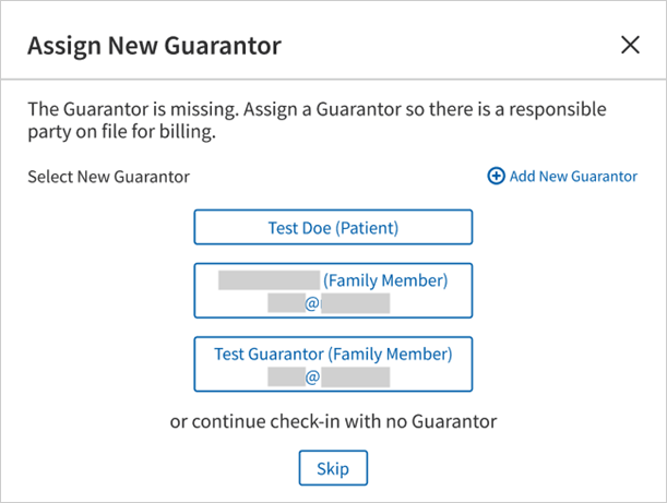 If you click Done with Check in for a patient that does not have a guarantor, the Assign New Guarantor window appears. You can either set the patient or an existing contact as the guarantor, create a new guarantor outside of the people on the contact list, or click Skip to proceed with check-in.