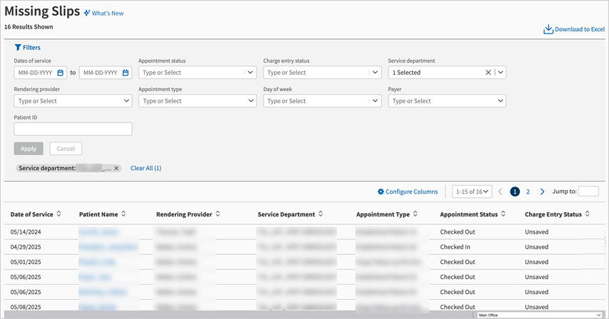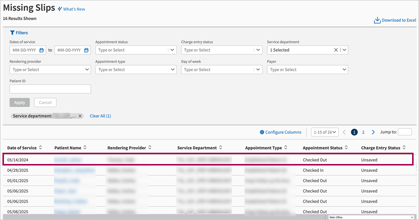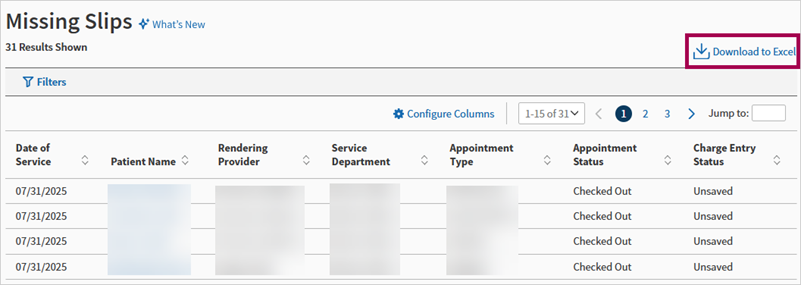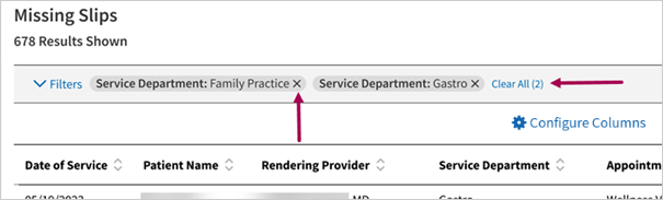 | Go to Missing Slip — Select anywhere on the row, except the linked patient name, to navigate to the Missing Slip (Charge Entry or Check Out). |