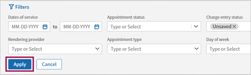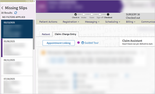 After saving your progress, you can navigate away from the page and return to enter charges on that appointment via the Missing Slips workflow or Today's Appointment worklist (because a claim wasn’t created yet).