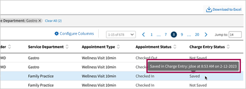 Hover over the status columns to see who checked the appointment out or saved charge entry and when.