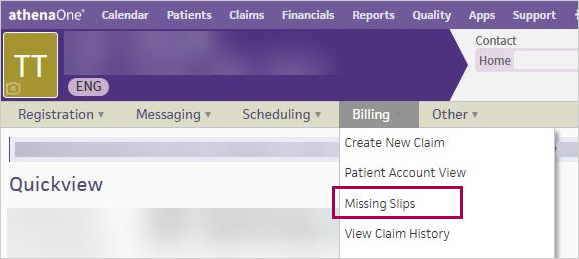 Patient Quickview > Patient Actions Bar > Billing > Missing Slips