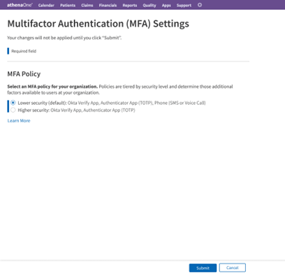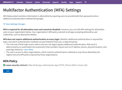 Users with access to multiple athenaOne practices with competing policies will be subject to the highest-security policy (i.e., that with the fewest additional authentication options) enabled by those practices.