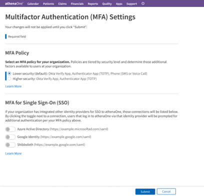 A practice might prefer to leave the toggle OFF for an SSO connection if MFA has been separately implemented and enforced through that identity provider. Otherwise, if the toggle for that SSO connection were turned ON, those users might be prompted twice for an additional factor (once through their identity provider’s MFA policy and again by the practice’s MFA policy in athenaOne) upon login to athenaOne.