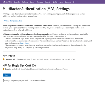 Multifactor authentication (MFA) is now required for all athenaOne users who do not log in through single sign-on (SSO). This requirement is in effect for all practices created on or after January 23, 2025 and is being rolled out to all other practices between January 16 and March 21, 2025. If your practice has not yet received this requirement, you can still enable and disable MFA per the section below (Administrators: Manage MFA settings for your practice (legacy workflow)).