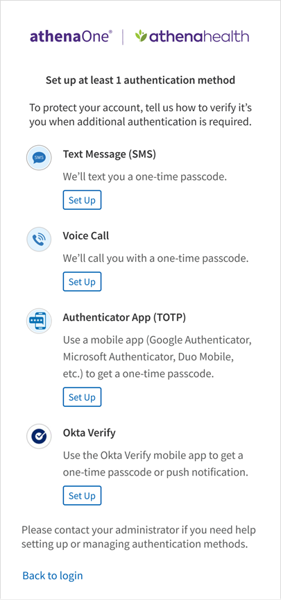 When MFA is enabled for your account, you will be presented with an additional authentication setup page on your next login. This page appears immediately after entering your username and password on the athenaOne login page (or the athenaOne Mobile app, or any other app accepting athenaOne username and password) and requires you to set up at least one authentication method before proceeding into athenaOne.