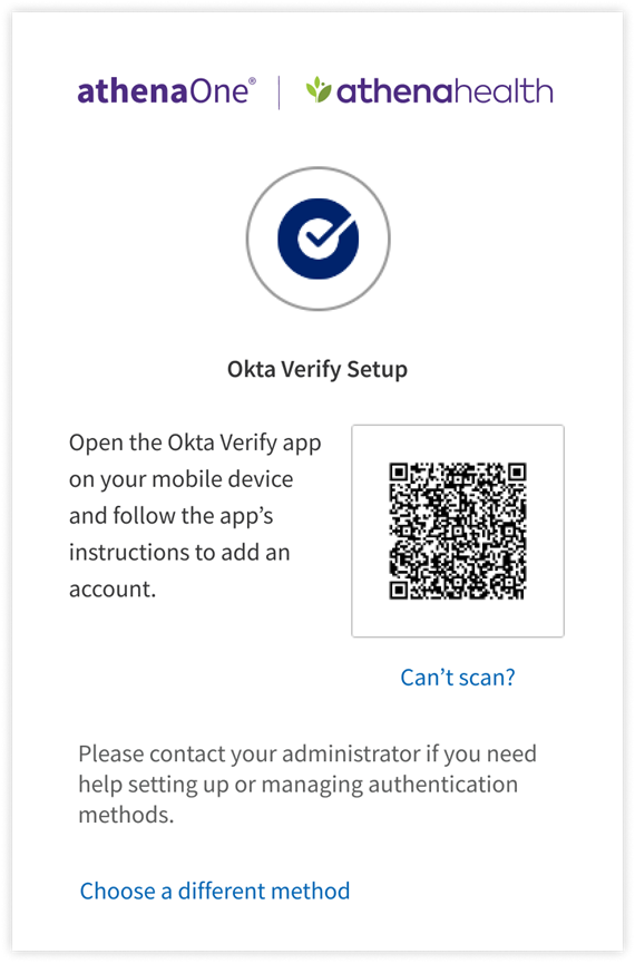 - To set up Okta Verify using the QR code, open the Okta Verify app on your mobile device, tap Add Account, choose Other as your account type, and then tap Yes, Ready to Scan to open your device’s camera to scan the QR code. When your device recognizes the QR code, it will automatically show the account as added in both the Okta Verify app and the device on which you are logging in to athenaOne.