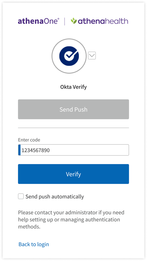 - If you click Or enter code, a field will appear to input the one-time code generated by your Okta Verify app. This code changes every 30 seconds (as indicated by a progress bar at the top of the app window) and will expire and not be accepted for authentication once a new code is generated. Therefore, you must be quick to input this code on the device on which you’re logging in to athenaOne. Enter a valid code in the Enter Code field and click Verify to complete setup.