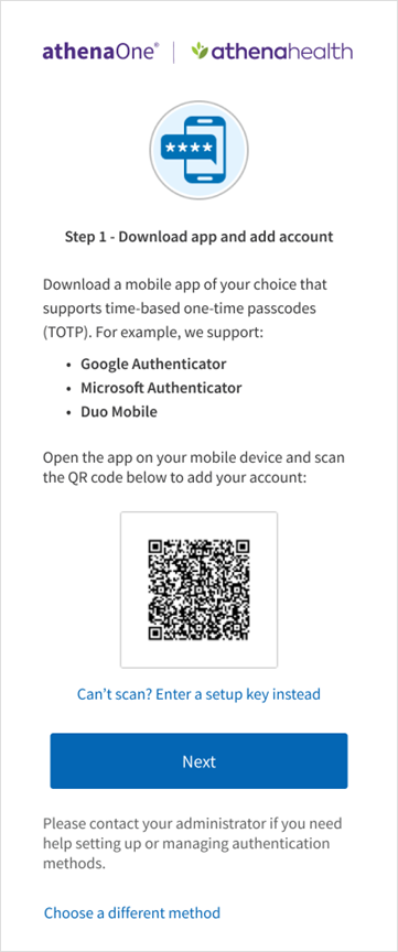 Following are the steps that you will perform to set up a time-based one-time passcode (TOTP) authenticator app as an additional authentication method for athenaOne login: