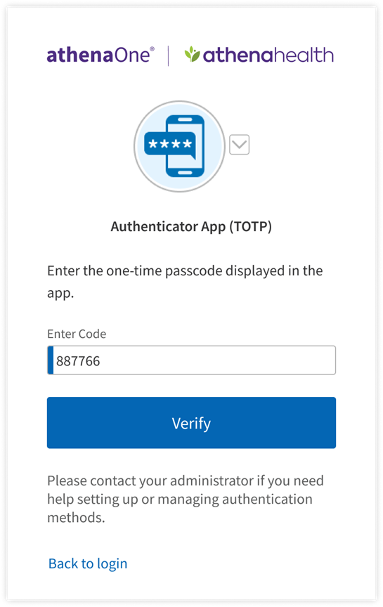 If you have previously set up Authenticator App (TOTP) as an additional authentication method and are prompted for MFA upon login, you can complete authentication by opening your authenticator app on your desktop or mobile device, then entering the one-time passcode generated by your authenticator app in the Enter Code field. This code changes every 30 seconds (as indicated by a circular progress indicator to the right of the code) and will expire and not be accepted for authentication once a new code is generated. Therefore, you must be quick to input this code on the device on which you’re logging in to athenaOne. Enter a valid code and click Verify to complete authentication and get redirected into athenaOne. If you have previously set up multiple authentication methods, you can click the toggle next to the Authenticator App (TOTP) icon to choose another method for authentication.
