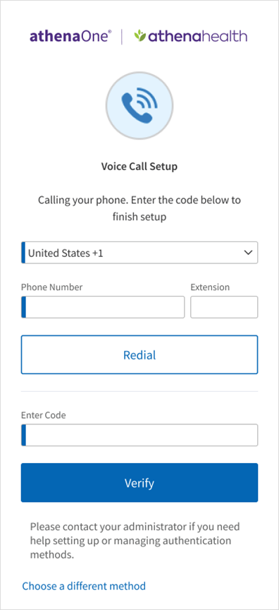 - Answer the phone call and listen for the one-time passcode. If you do not answer this call, you will receive a voicemail with the code instead. Enter this code in the Enter Code field and click Verify. If the code is valid, your authentication is complete, and you will be automatically redirected into athenaOne. If after a minute you have not received a phone call with your one-time code, you will see a prompt to click Redial to receive a new one.