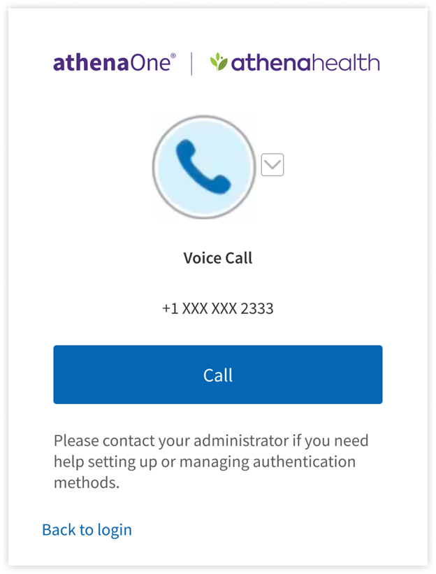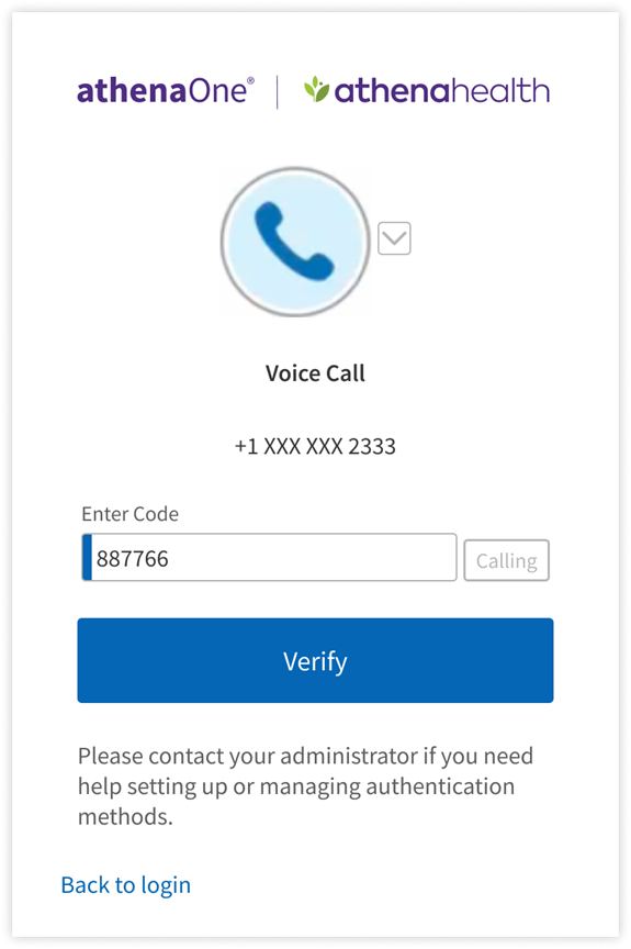 If you have previously set up Voice Call for additional authentication and are prompted for MFA upon login, you can complete authentication by:clicking Call to receive a phone call at the number you originally used to set up your voice call factor, for which the last four digits are shown on your screen. If you do not answer this call, you will receive a voicemail. Enter the code received in that call or voicemail in the Enter Code field and click Verify to be redirected into athenaOne.