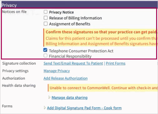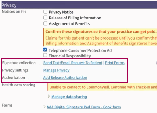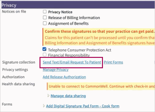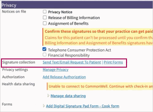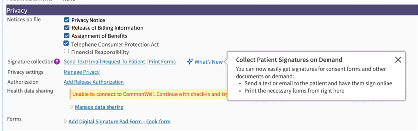 Indicates whether a patient prefers to receive provider-signed letters and the Patient Care Summary on the Patient Portal or on paper. This preference persists from appointment to appointment. You can set it on the Quickview, Check-in, Checkout, or Patient Registration page. Note: For ambulatory departments that use athenaClinicals without athenaCommunicator, your patients can access their electronic Patient Care Summary online using the Patient Information Center, a slimmed-down version of the athenaCommunicator Patient Portal. |