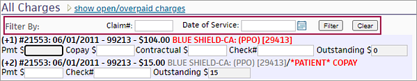 The Charges section (Open Charges or All Charges) displays the show all charges or show open/overpaid charges link. When you click show all charges, you can use the displayed filter fields to locate charges for a specific claim only or for a specific date of service.